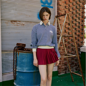 Kandini Women Striped Puff Sleeve Zip-up Polo Shirt Long Sleeve