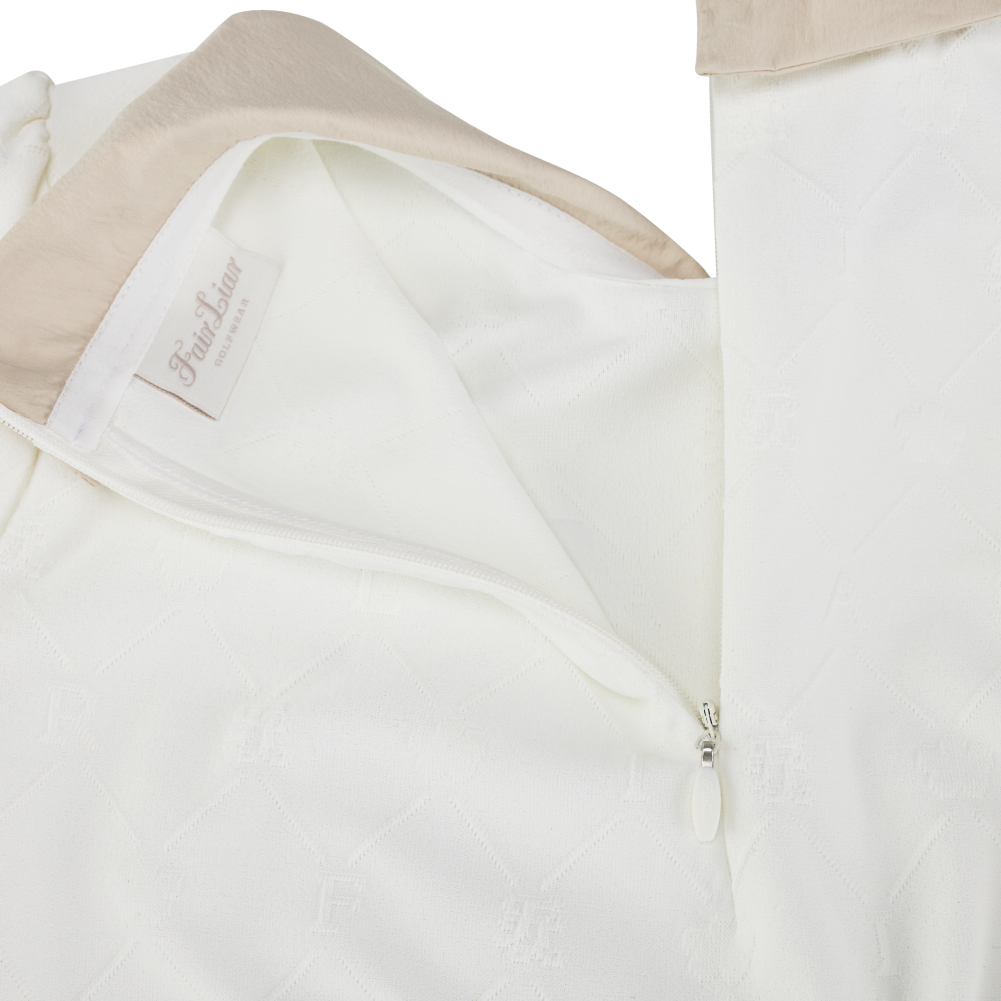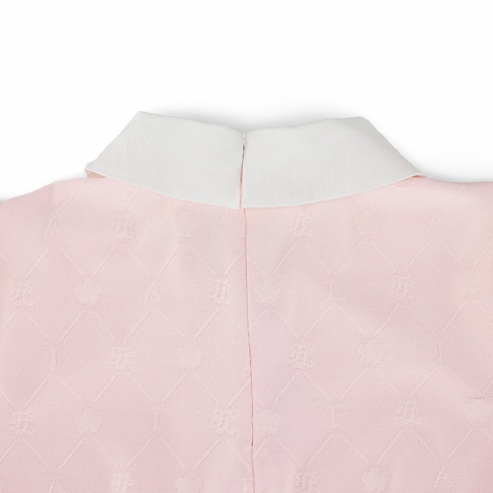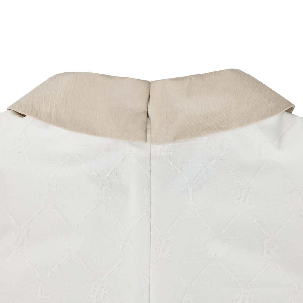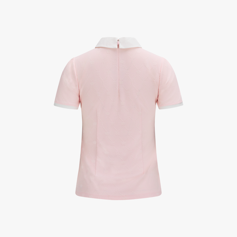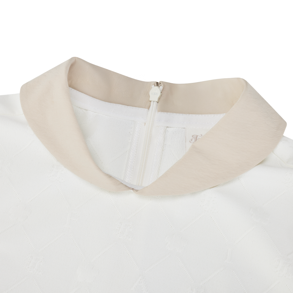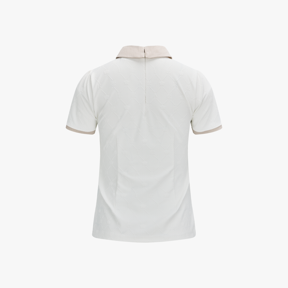 A sophisticated petit collar t-shirt crafted from jacquard fabric featuring an embossed Fairliar logo pattern. The luxurious texture is enhanced with refined contrast color accents, adding a polished and stylish finish. Designed with subtle shoulder puff details and a slim-fit silhouette, this piece creates a feminine and clean look. The slightly longer length that gently covers the hips offers a comfortable and secure fit.