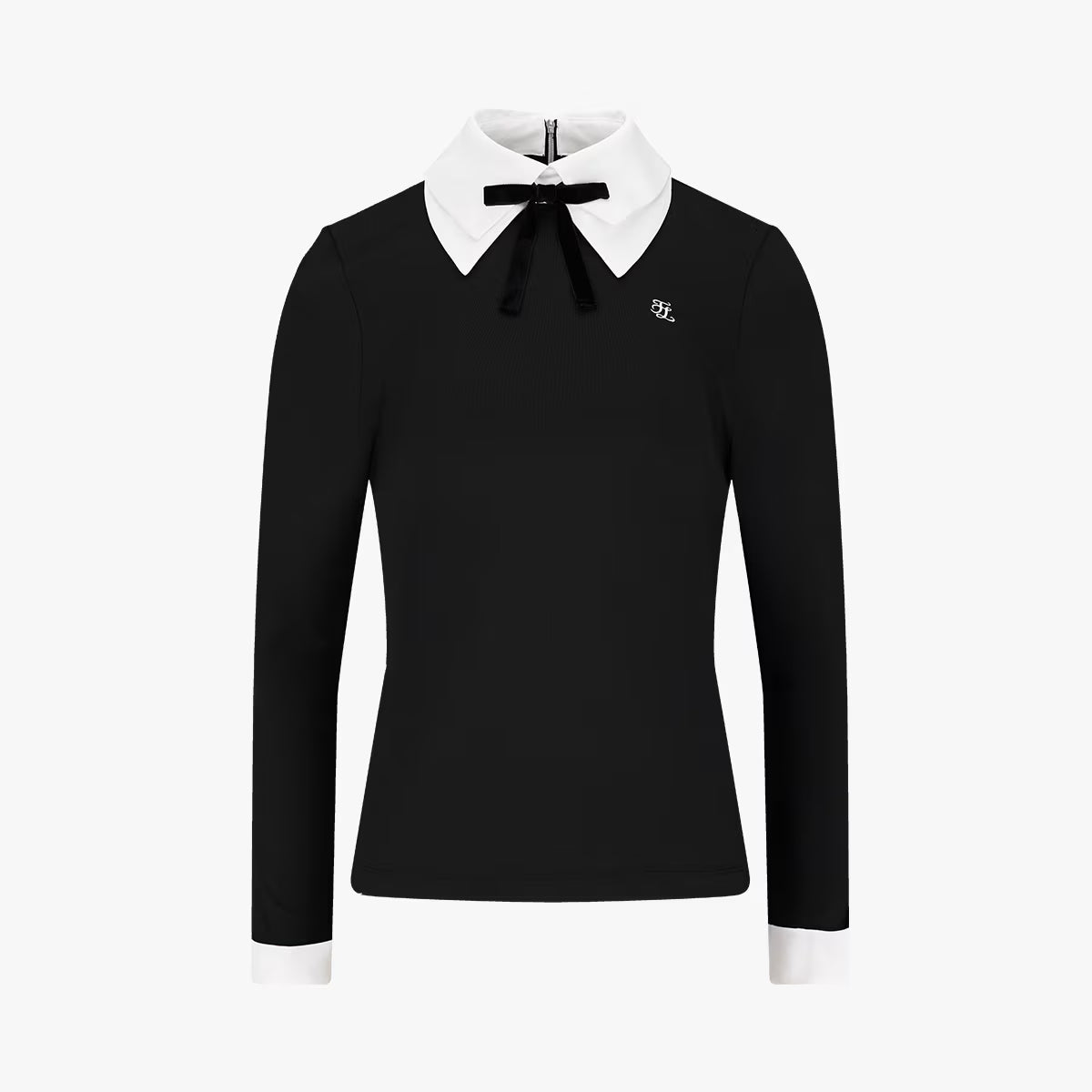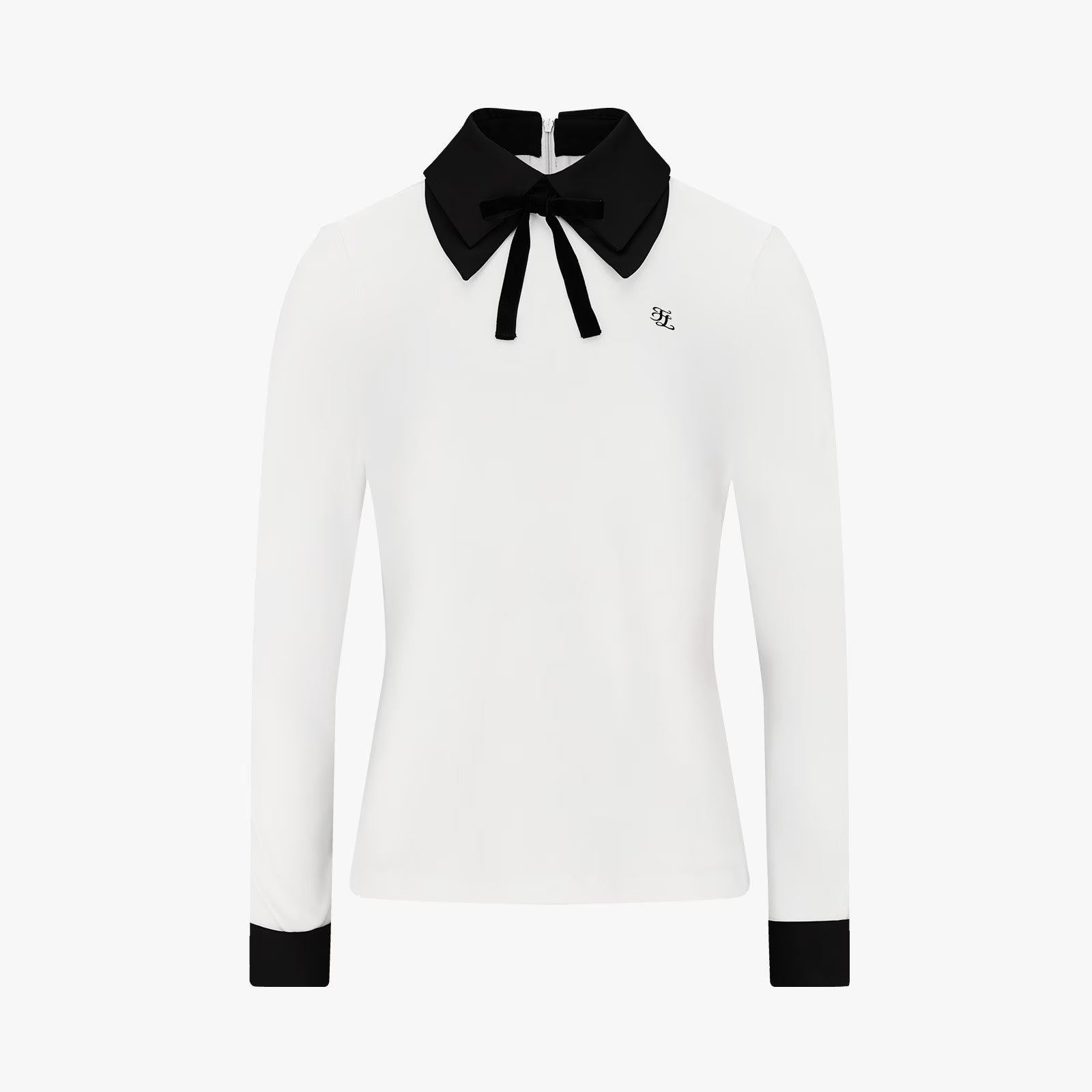 The glossy satin white collar and ribbon detail brighten the face and deliver an elegant, refined style — a statement piece on its own.