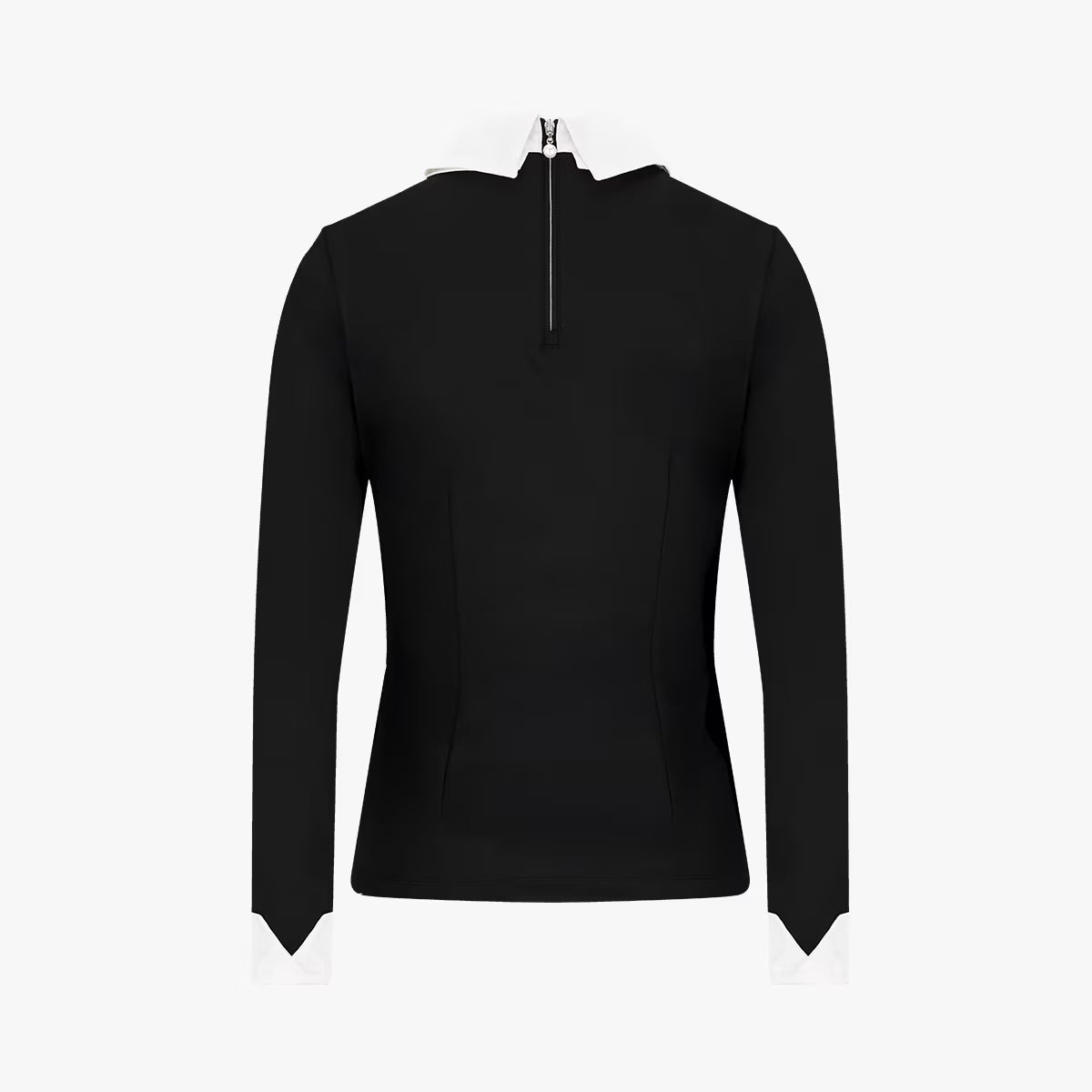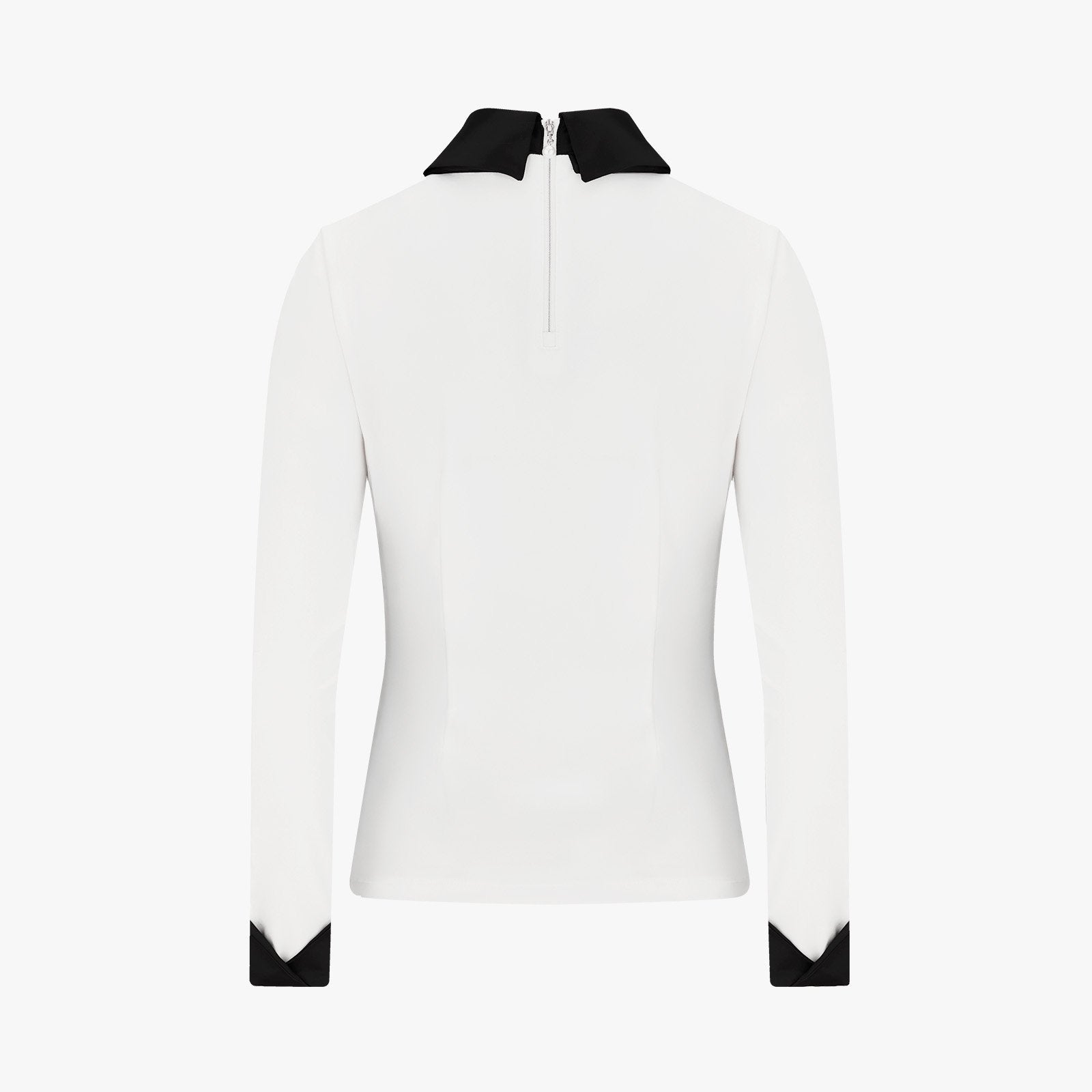 Contrasting white cuffs with a glossy touch highlight the silhouette and elevate refined detail.