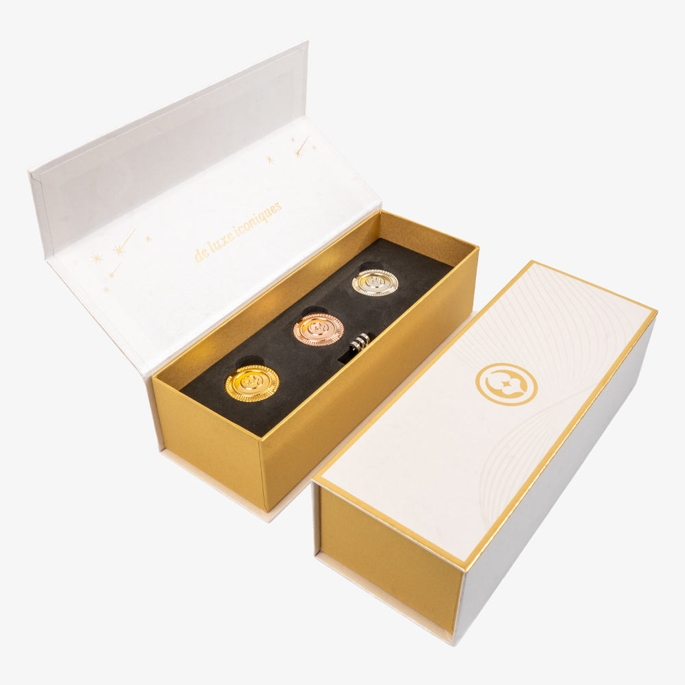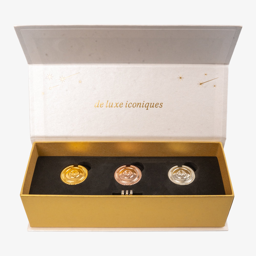 3-piece ball marker set in gold, rose gold, and silver plating. Minimal yet refined, adding a subtle touch of elegance to your game.