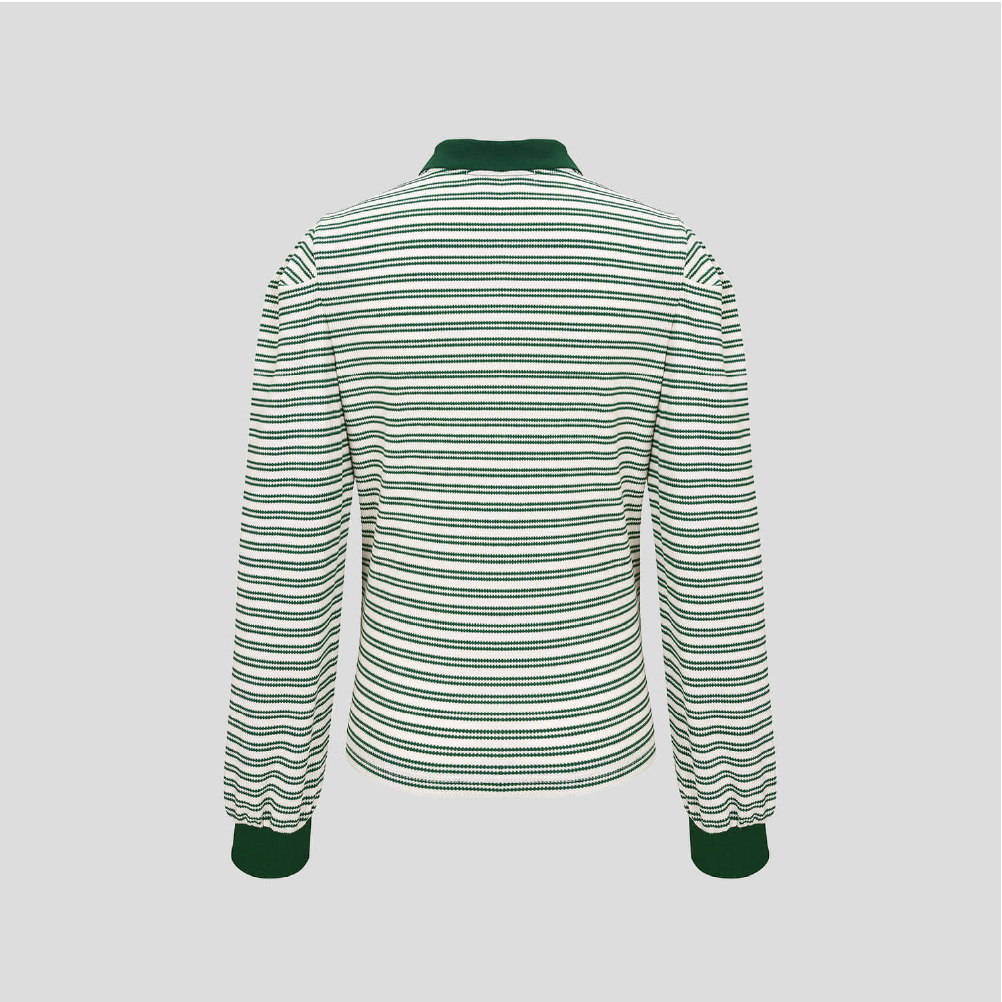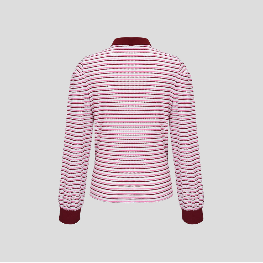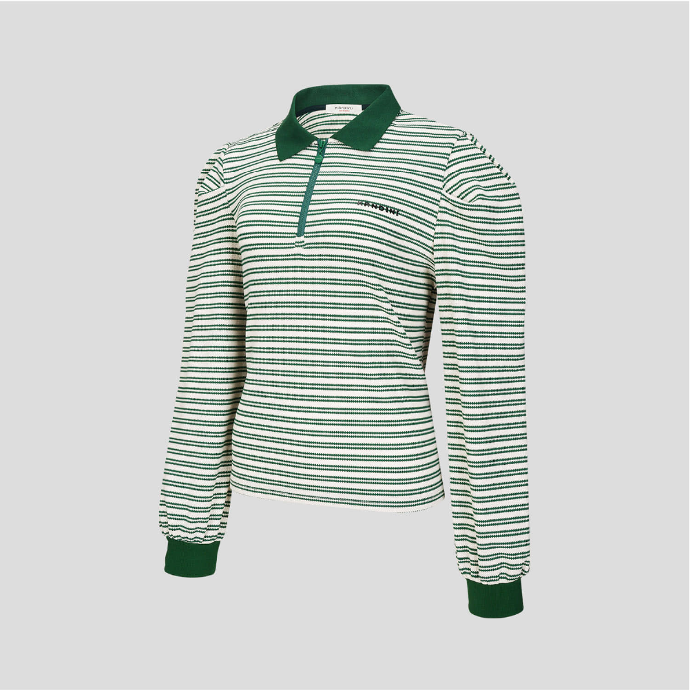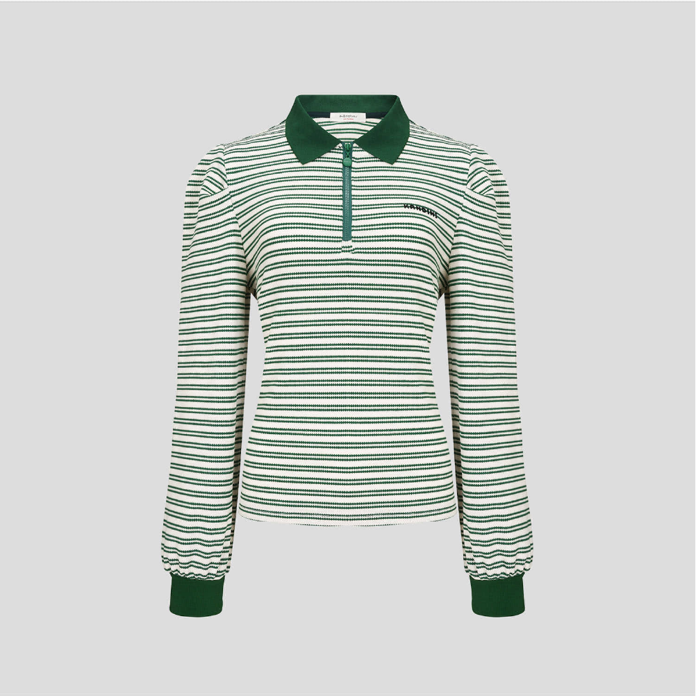 Kandini Women Striped Puff Sleeve Zip-up Polo Shirt Long Sleeve