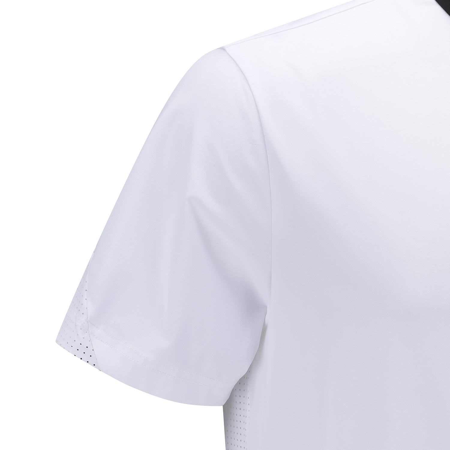 THE SLEEVES AND BACK ARE BREATHABLE USING A PARK FABRIC, AND EVEN IN MIDSUMMER, IT IS VERY COMFORTABLE TO WEAR GOOD. AN ACTION BAND IS APPLIED TO THE BACK PANEL FOR MORE COMFORTABLE SWING,AND A SPORTY INCISION LINE IT IS A DOO-ING ITEM THAT ENHANCES THE PERFORMANCE FEELING.