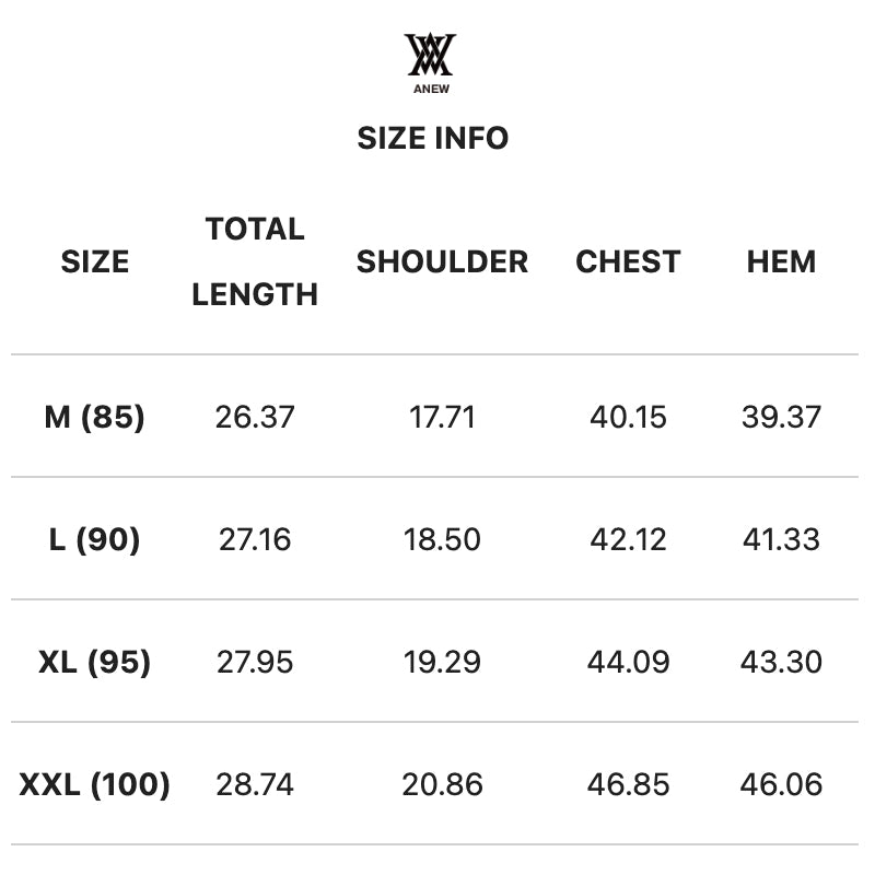 | SIZE | TOTAL LENGTH | SHOULDER | CHEST | HEM | SLEEVE |