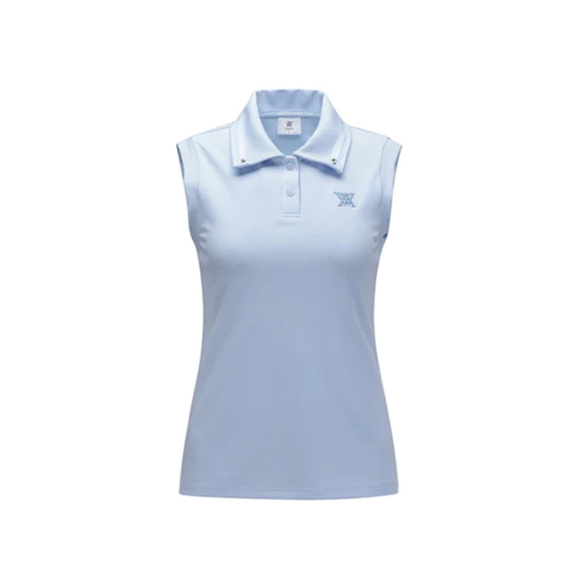 THIS IS A SLEEVELESS T-SHIRT DESIGNED BY MIXING BONE TISSUE AND SOLID MATERIALS. THE HIGHLY ELASTIC RIBBED MATERIAL SUPPORTS FREEDOM OF MOVEMENT. THE SEMI-WIDE COLLAR ADDS A FEMININE FEEL. YOU CAN FEEL THE STYLISHNESS OF THE NEW WITH COLOR-COORDINATED TAPES AND STUDS.