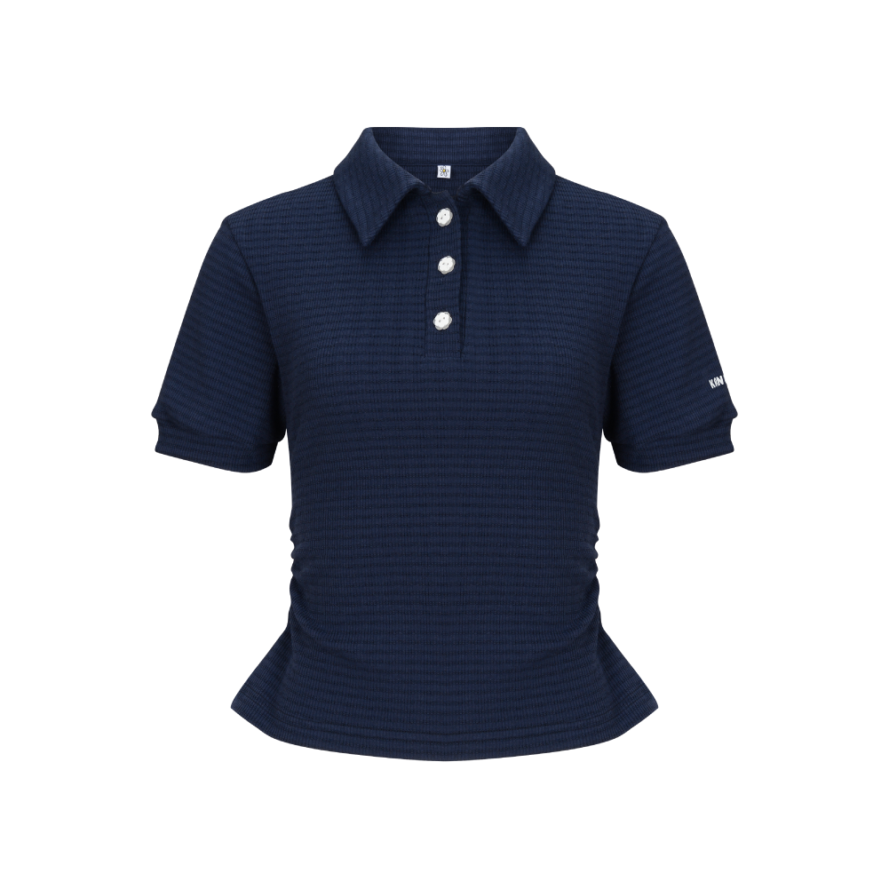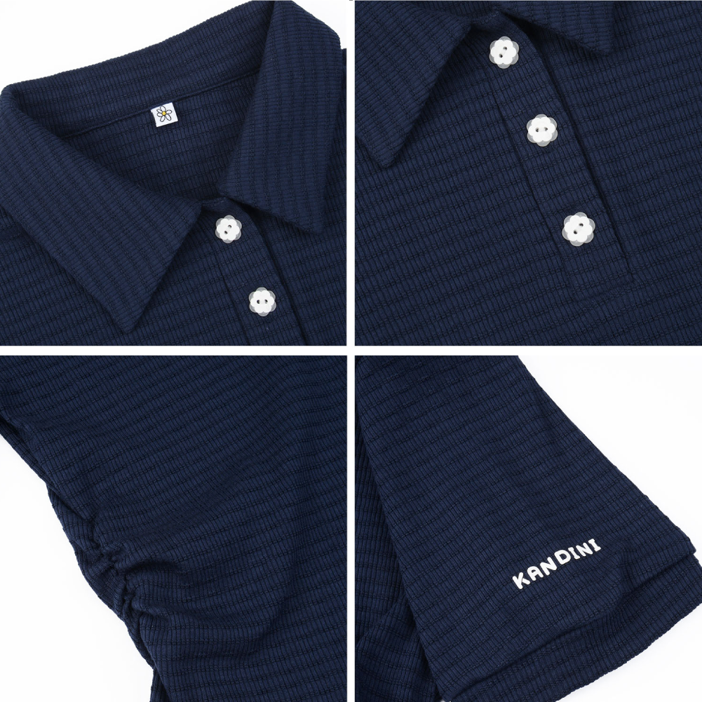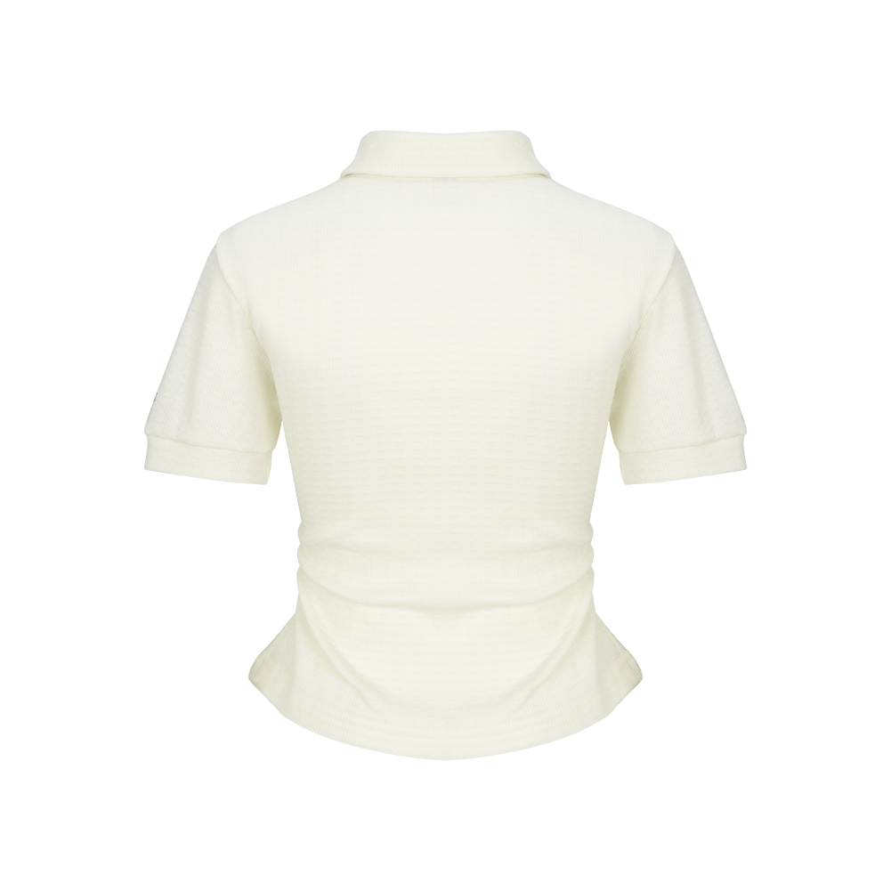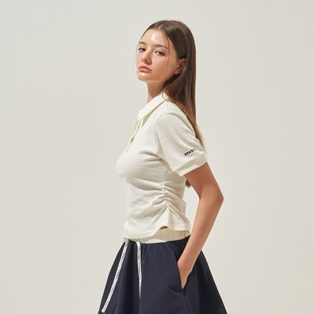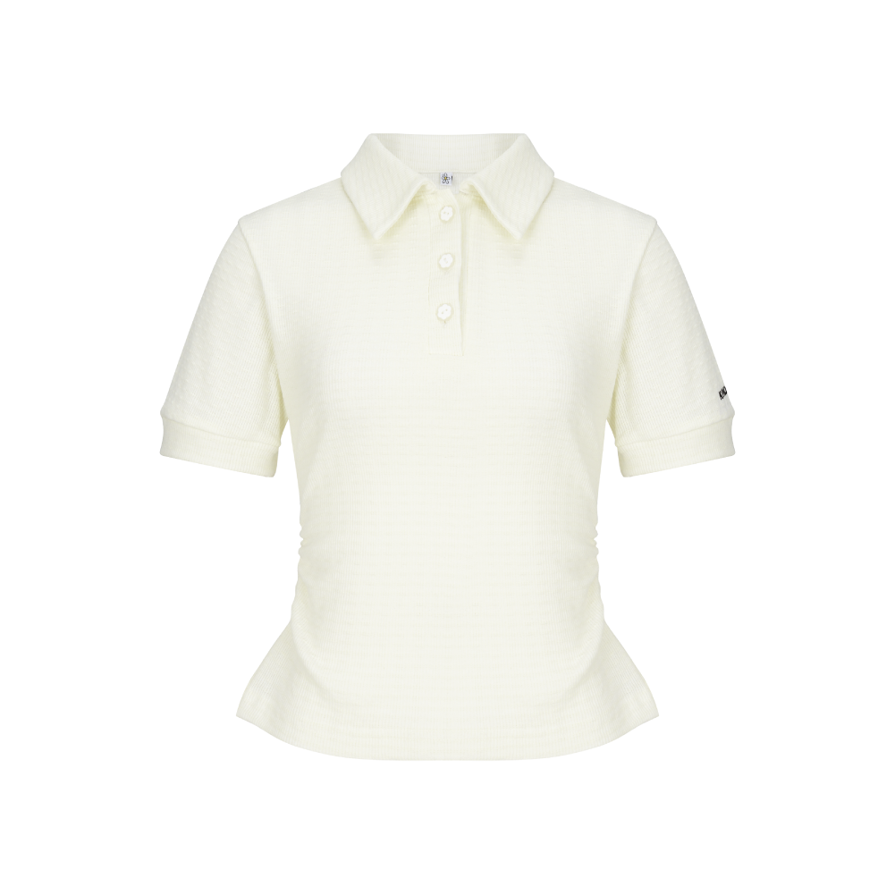 Made from breathable ribbed fabric, this piece offers comfort and ease throughout the day. The side shirring detail enhances the silhouette by creating a more defined and flattering line. A puff-textured fabric combined with a semi-cropped length adds a feminine touch. Designed with stretch for a comfortable fit, it moves effortlessly with your body. The clean collar design and slim fit create a classic yet refined golf look.